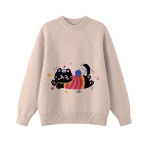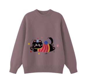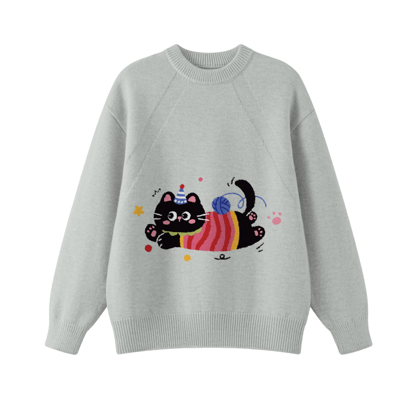 Add playful cozy charm to your daily outfits with this adorable cat graphic knit sweater. It features a super cute fluffy black kitten wearing a tiny party hat and colorful striped outfit, happily pouncing on a yarn ball with fun star and dot accents. Set on a soft light gray base, this classic crewneck design delivers a warm, gentle and whimsical vibe.