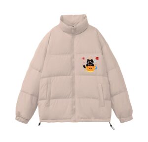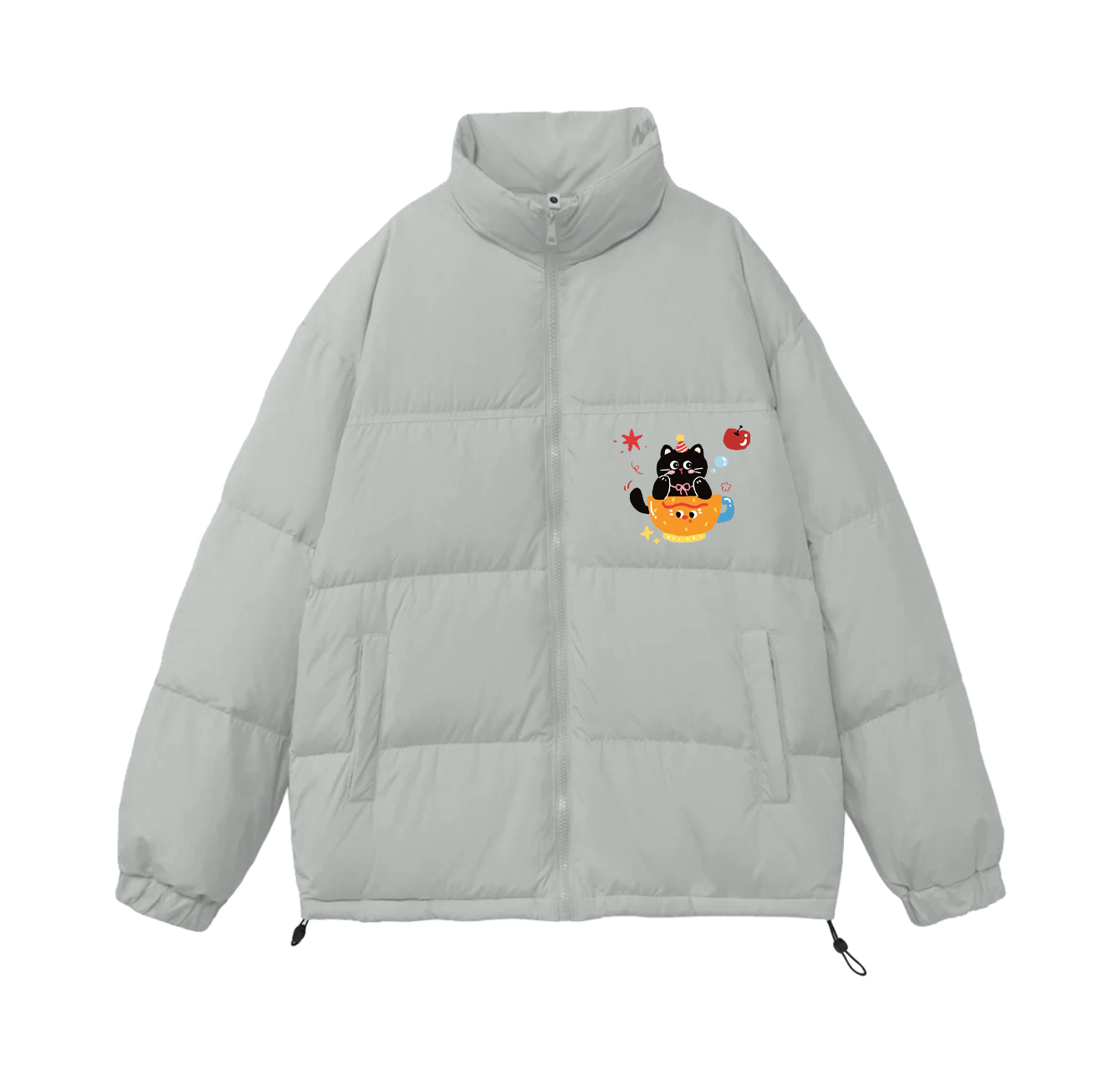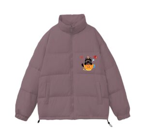 Level up your cold-weather wardrobe with this whimsical party cat graphic puffer jacket. It features an adorable festive black cat wearing a tiny party hat, sitting cheerfully inside a smiling teacup, accented with cute apple, star and bubble details. Set in a soft muted dusty purple tone, this loose oversized silhouette delivers maximum warmth and trendy casual charm.