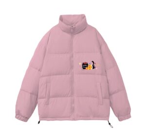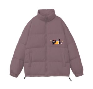 Stay cozy and stylish this winter with this adorable cat graphic puffer jacket. It features a charming illustration of a black kitten wearing a tiny tomato hat, snuggling a polka-dotted gift box, surrounded by delicate little flower accents. Set against a dreamy dusty purple base, this jacket blends sweet kawaii charm with ultimate warmth. Crafted with a relaxed oversized fit and classic stand-up collar, it provides a laid-back effortless look perfect for cold days.