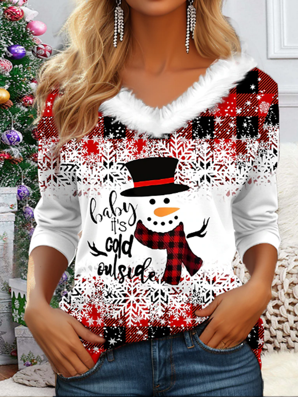 Women’s Christmas Snowman Print Long Sleeve V-Neck Top