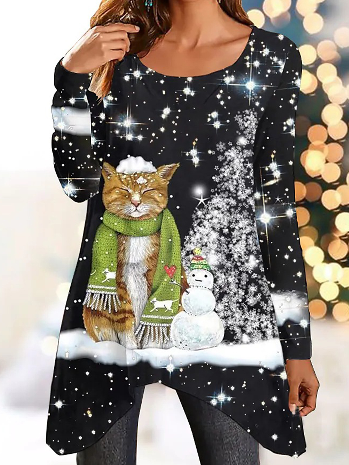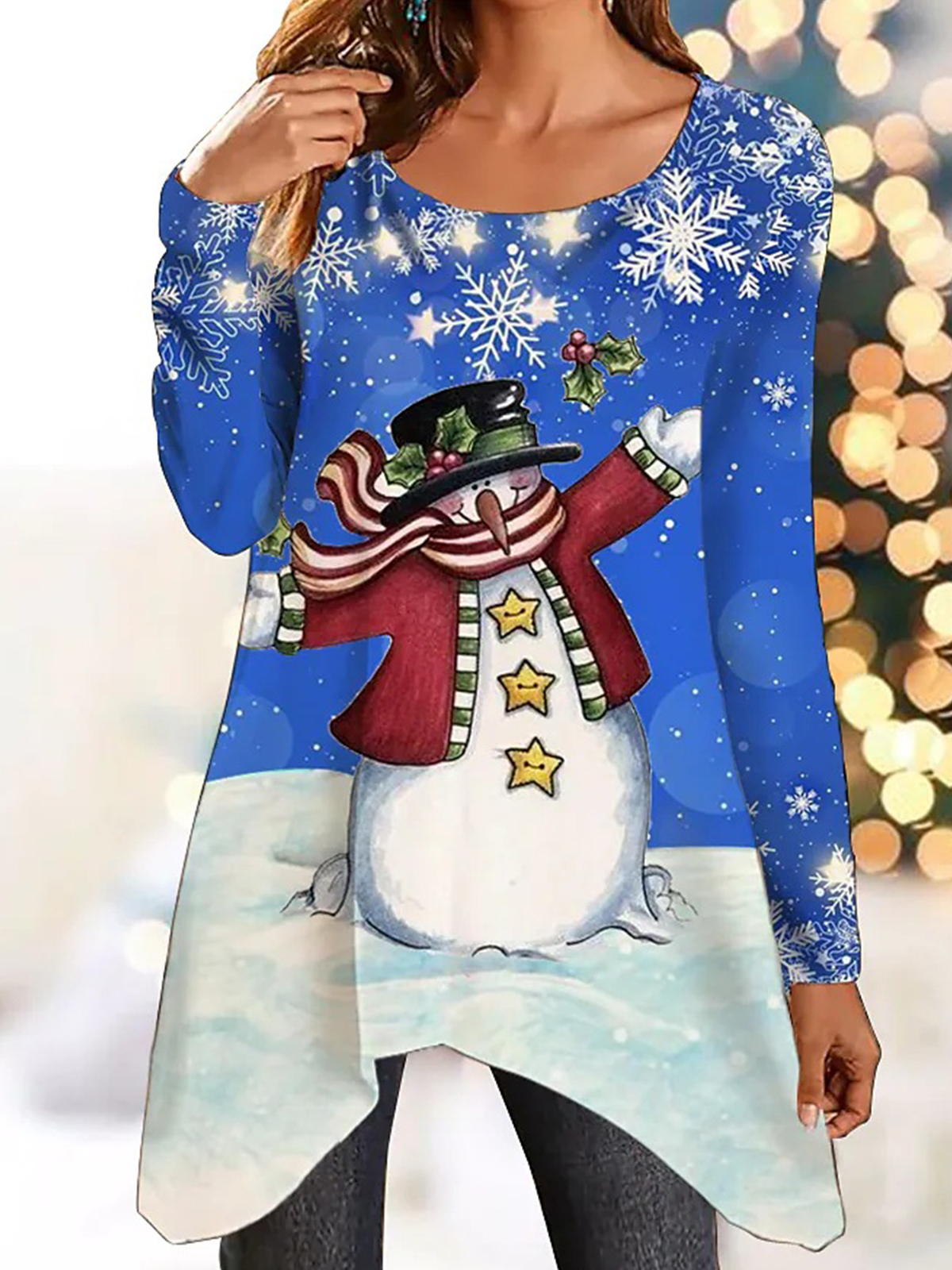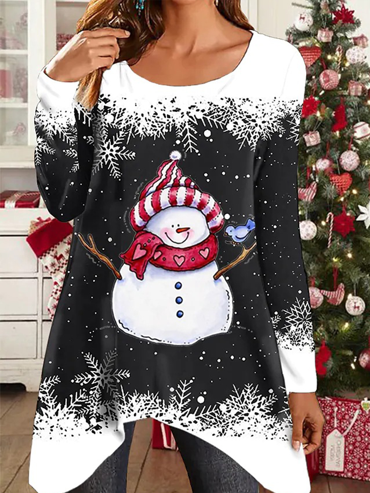 Women’s Christmas Snowman Snowflake Print Irregular Hem Long Sleeve Top